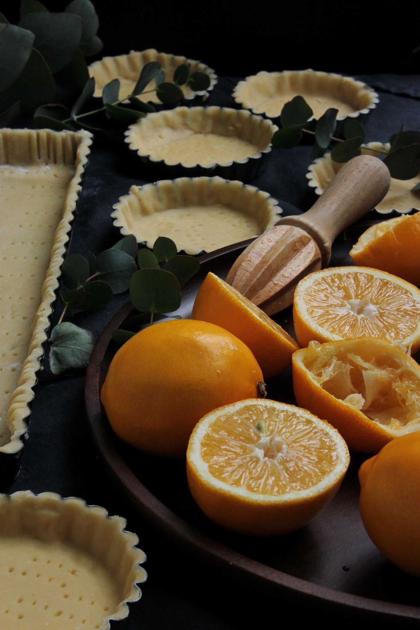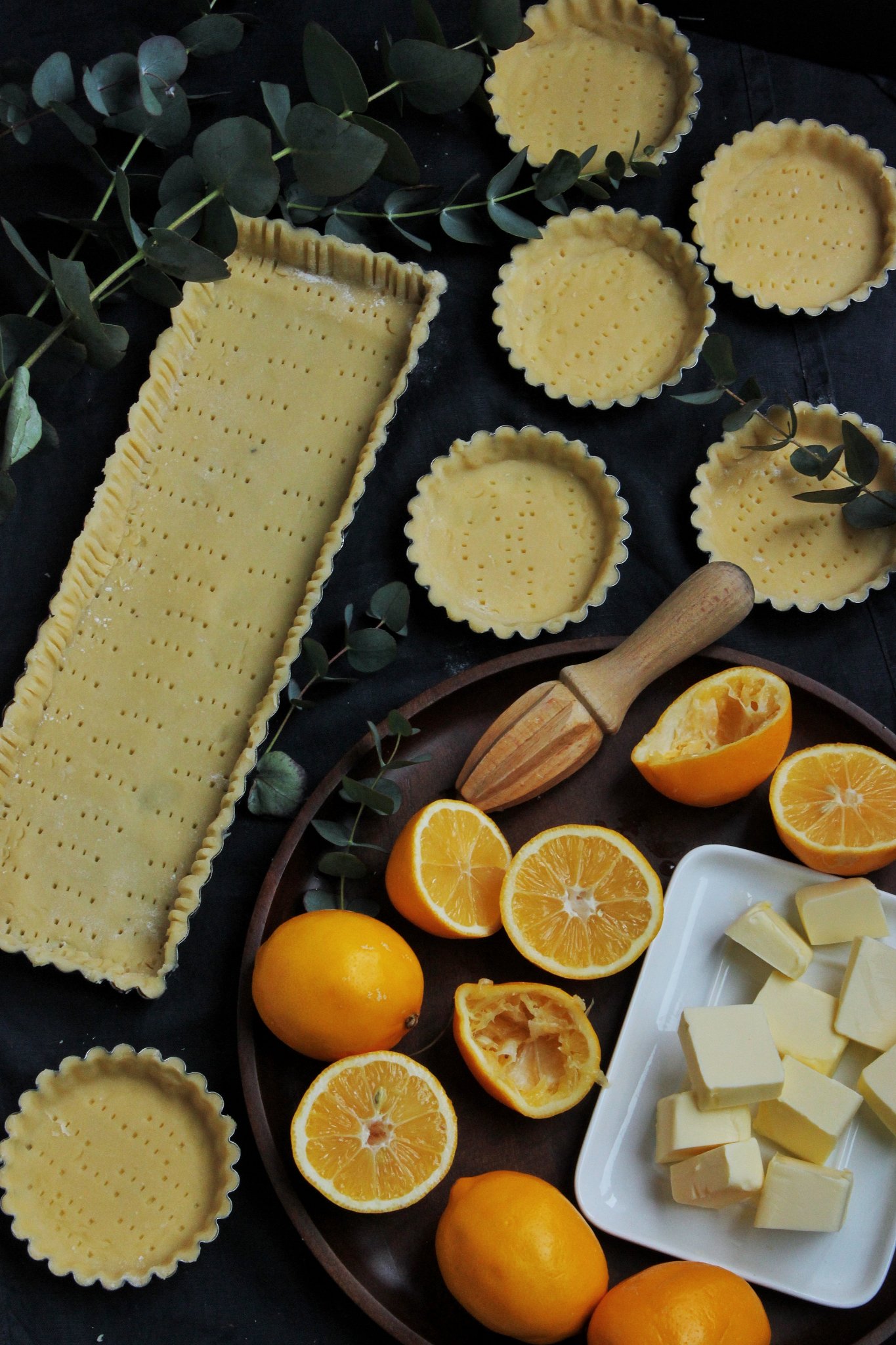 - A tésztához a hozzávalókat egy késes robotgépbe kimérjük, majd addig keverjük, amíg a tészta gombóccá nem áll össze. Késes robotgép hiányában a lisztet elkeverjük a sóval és a cukorral. Hozzáadjuk a vajat, kezünkkel összemorzsoljuk, majd gombócot formázunk belőle. Amikor a tészta összeállt egy alaposan lisztezett deszkán a sütőformánknak megfelelő méretűre nyújtjuk. A formánk alját szilikonos sütőpapírral kibéleljük, és a kinyújtott tésztát belehelyezzük, majd egy villa segítségével több helyen megszurkáljuk.